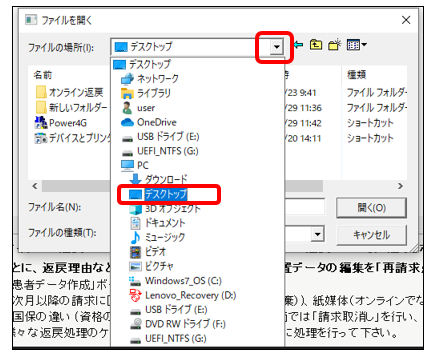 ⑨ファイルを選択する画面が出ますので、デスクトップをクリックで指定します。