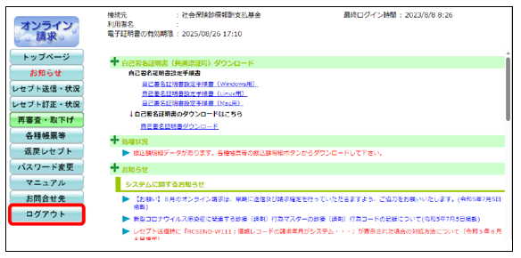㉓オンライン請求サイトからログアウトし、操作終了です。