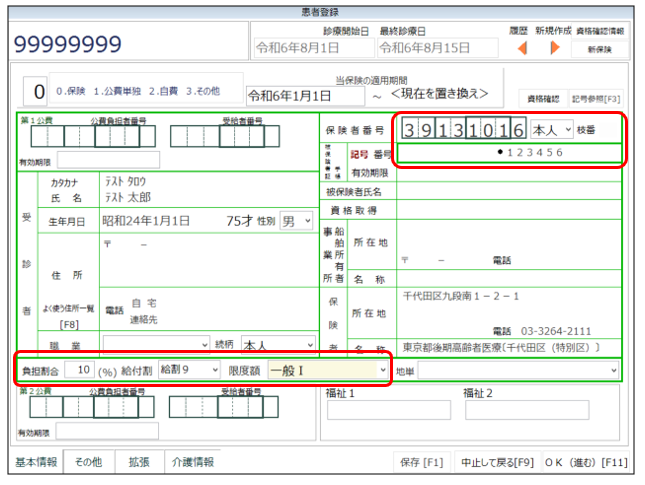※例では後期高齢1割と仮定し、後期高齢の保険証情報・10%給付9、限度額一般Ⅰで登録。