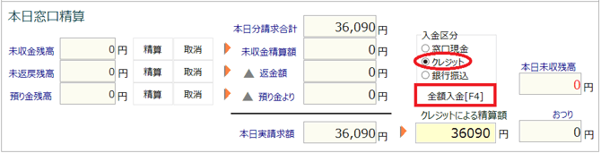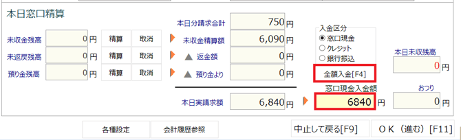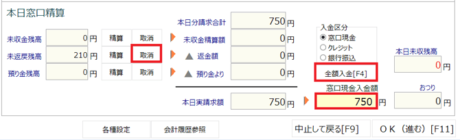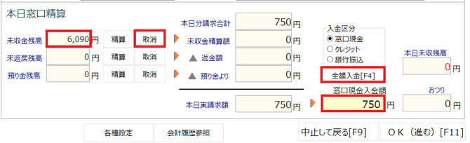 「取消」ボタンをクリックし、未収金残高に移動させてから、「全額入金」ボタンをクリック、または受け取った金額を入力し「Enter」キーを押します。