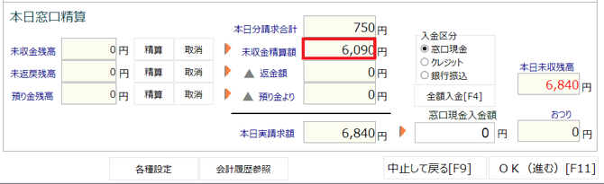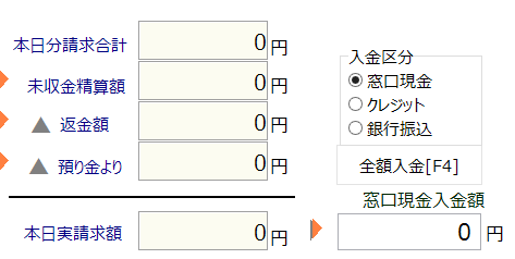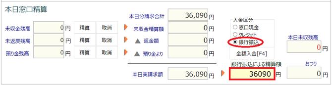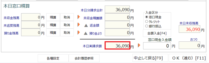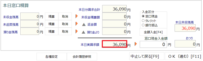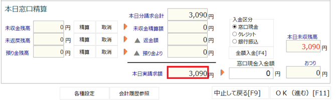「本日分実請求額」欄には、「本日分請求額合計」と「未収金精算額」が足された金額が表示されます。