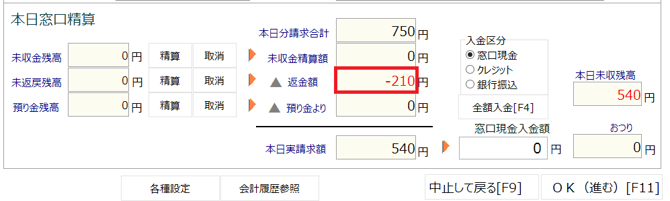 ①前回の会計後に処置を削除した場合、「返金額」が上がってきます。