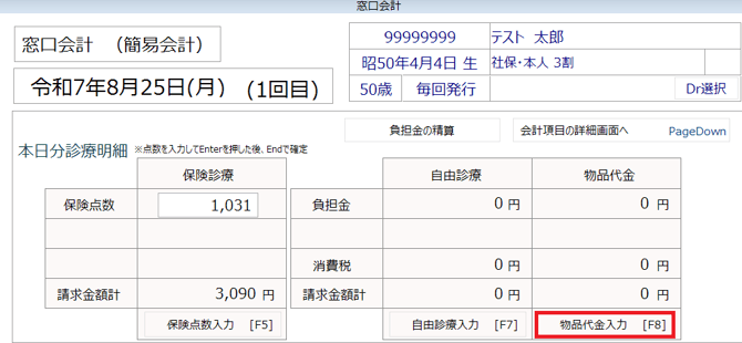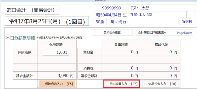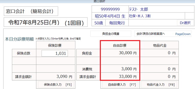 ①処置入力後に窓口会計画面を開くと、自由診療の欄に入力に応じた請求金額が表示されます。