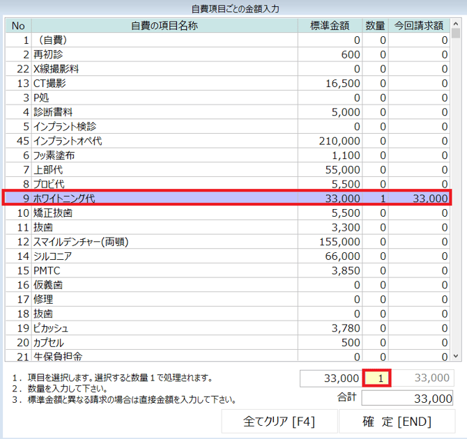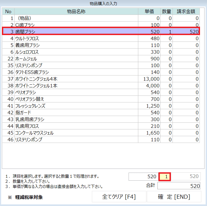 ②該当の項目を選択し、「数量」を入力し「Enter」キーをクリックします。