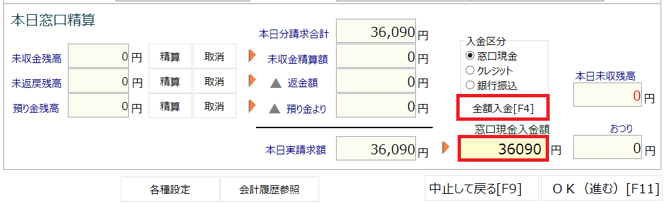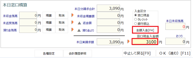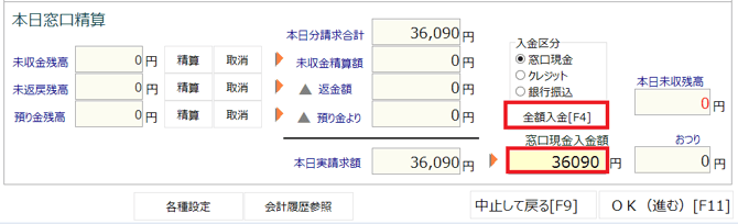 返金額よりも請求額の方が大きい場合は、「全額入金」ボタンをクリック、または受け取った金額を「窓口現金入金額」欄に入力し「Enter」キーを押し、「OK」を押します。