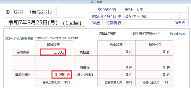 ①処置入力後に窓口会計画面を開くと保険点数と負担割合に応じた請求金額が表示されます。