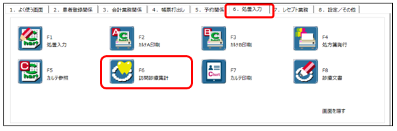 ①メインメニューより、「6処置入力」タブの「訪問診療集計」を選択します。