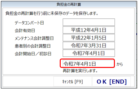 ③領収書を印字したい月の1日付けで、負担金再計算を行います。